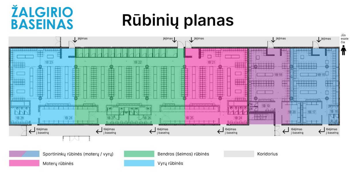 Taip, turime bendras rūbines su persirengimo kabinomis.